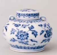 罐小口,短颈,肩两侧各有一圆形小系,扁圆腹,浅圈足,盖为覆扣式。青花纹饰,主体绘折枝四季花,辅以仰覆莲瓣纹。