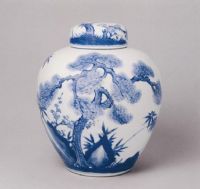 罐直口,短颈,圆腹下收,圈足,圆盖。器身通景青花绘松、竹、梅、空间衬以洞石、灵芝等花草