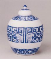 罐小口,短颈,丰肩,平底,圈足。馒头形盖,宝珠钮。通体青花饰饕餮纹。