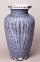 尊撇口,短颈,直腹,圈足。通体以青花书写“寿”字,分布于口,沿、腹、足四个部位。