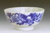 碗撇口,深腹,圈足,碗内光素,碗外青花绘折枝朵花纹饰,构图饱满,用笔娴熟。