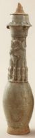 瓶敛口斜直唇,口沿下有凸檐,颈细长,腹呈腰鼓状,圈足外撇。带盖,顶部有立鸟。颈部堆塑有日月龙虎及十二生肖。