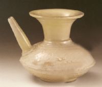 喇叭形口,长颈,扁圆腹,饼形底,腹一侧附细长管状流;形制精巧,为佛教僧侣的净手用器。器物胎体匀厚,胎色颇白。