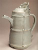 壶身呈竹筒圆柱状,上细下粗。矮圈足,足脊宽平无釉。方形流,扁条形曲柄,两端贴卷云形装饰。