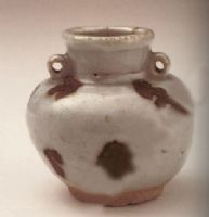 唇口,短颈,圆腹,平底,底部无釉。肩部有圆形双系。通体施青白釉,器腹釉下点洒褐色斑点,係氧化铁着色。同类造型作品还有青白釉、青花等品种,均为小件器。