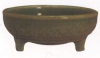 口微斂,圆唇,淺弧腹,三扁形獸足。內底平坦,腹部刻劃菱形紋带。通體施青釉,光亮透明,如青玉般柔和淡雅。胎體細膩堅致。
