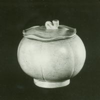 内敛口,圆腹,圈足,器身划六棱,刻有鹦鹉、荷花、荷叶纹,线条纤细,器盖作荷叶形.