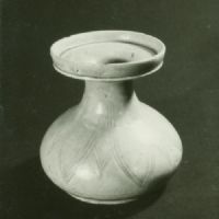 盘口,细颈盘口,细颈,溜肩,垂腹,矮饼足,肩腹刻莲瓣纹,底部有泥点痕.
