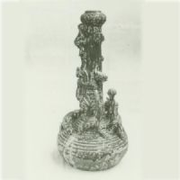 夹砂褐胎,釉不及底,头部作蒜头状,竹节形长颈,扁圆腹,平底,颈部堆塑一人拥抱瓶的颈部,作攀登状,背面一人倒立,两手搭着攀者的右臂,周缘三兽头相间五飞禽.上腹部饰凹弦弦纹数周,一人左手执棒,右手牵一虎,另一人侧视,左手执棒,右手牵龙,,龙虎之间,各塑一引颈巨禽.