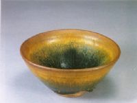 敞口,内沿以下一周微凸,斜壁深腹,小圈足较浅,施黑釉,釉面显现兔毫结晶斑纹。外壁釉不及底并有聚釉,炸釉现象,胎体厚重,呈铁褐色。是建窑茶盏的典型器物。