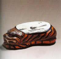 枕形呈卧虎形象,虎背平坦作枕面。灰胎,施白色化妆土。枕面作腰圆形,内以黑彩绘芦塘鹡鸰图,具典型中国写意画风格,笔法潇洒自如。虎头及身以黑彩描绘毛发和斑纹,除眉、眼、口、牙几处用极浅而薄的褐色轻涂外,余皆罩以较深的褐色。