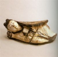 枕整体雕塑一童子侧卧于圆枕之上,安然入睡。枕面如意云头形,覆盖童子身体。通体白釉褐黑彩彩绘,童子头梳双髻,双手合拢,怀抱书卷,眉清目秀,一脸稚气,姿态自然优雅。