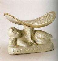 浅灰白色瓷胎坚而细,施牙黄色釉。枕座为一模塑的胖孩童侧卧在榻上,双手紧抱巨叶莲埂,叶大