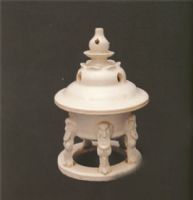 胎白质细,釉色洁白,将军盔式盖。盖壁和瓶腹环有六个交错的桃形煙孔,炉身盘口,腹斜直,折为平底,炉身下塑五个兽面衔环蹄足,足踏於环形平托之上。