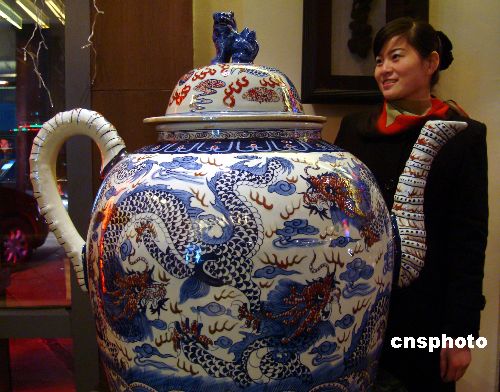 2009年1月2日,一名女士在观赏景德镇陶瓷巨壶。近日,一把可供300人同饮的景德镇陶瓷巨壶在苏州一家陶瓷商店亮相。据了解,这把陶瓷巨壶高约120厘米,壶身直径约85厘米。