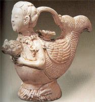 壶身作鱼龙形,头部中空为流,鱼尾部上翘,背上有莲瓣形壶口。腹刻双翼。人首为少女头像,发饰双丫髻,颈部饰飘带,腕带手镯,双手捧龙头短注,圈足两侧塑有龙爪。