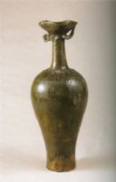 花式盘口,细长颈,溜肩瘦腹,腹下曲线内收,平底略外展,红陶胎,上白色化妆土,施绿釉,施釉较薄,隐现修胎痕迹。
