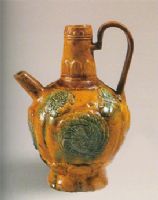 长直口,丰肩鼓腹,胫内收,肩前置短直流,后置扁曲把,圈足。灰陶胎,三彩釉,口沿下印两周弦纹和一周仰莲瓣纹,颈基处印仰、覆莲瓣纹两周,肩印两只蝴蝶和两组团花,腹部印四组团凤纹作为主题纹饰,胫印一周仰莲瓣纹。