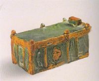整器呈长方箱形,底未封闭,床面塑长方枕,绕床边缘置六个柱头,两侧面印菱形、变体蝴蝶形、海棠形装饰,并间以隔段,前后档板印变体海棠花形纹饰。