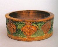 盘敞口,宽折沿,浅腹,圆筒形高座,平底。淡黄色陶胎,较坚硬,上白色化妆土,内施黄釉,座外壁施黄、绿两色釉。