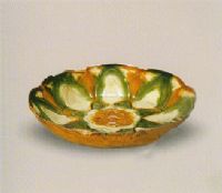 模制成型,呈八曲海棠花式,浅腹,弧壁,平底。淡红色陶胎,上白色化妆土,施三彩釉。碟内满印复瓣莲花一朵,与碟的造型相重合,使中体碟宛如一朵盛开的莲花,再配以黄、绿、白三彩釉,更显得光彩明艳,给人以视觉的享受。此碟设计奇巧,作工精湛,当系赤峰缸瓦窑的产品。