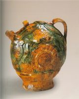 模制成型,壶为扁圆体,圆唇口,前置牺首管状流,后置半环状扁把与牺流相对应,口前置一环状穿带鼻,平底假圈足,足微外撇。淡黄色陶胎,坚硬细腻,上白色化妆土,施黄、绿、白三彩釉。