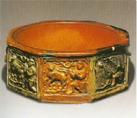胎呈红色。器呈八角柱形,平底。内口为圆形,圜底。外壁八面皆浮雕西亚人戏狮纹,黄褐、绿色彩釉相间排列,内壁施黄褐釉,底无釉。出土时,内盛肉食供品。