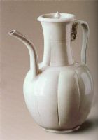 壶长颈,瓜棱形圆鼓腹,圈足,壶盖小钮平面,肩部前出细高弯流,柄仿金属器扁带式曲柄。