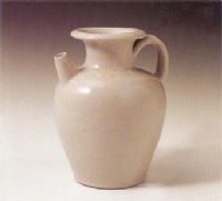 圆口捲沿,长颈,阔肩,肩与腹无明显分界,壁向下敛,平底。肩部向前伸出短流一,後部有一不规则半環鋬,上与劲部相连,下与肩部相接,器表施白色釉,器底无釉胎,表面上有化妆土。此壶釉色洁白,莹润光泽,有细小开片纹,是唐代白瓷的代表作。