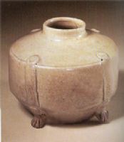 罐直口,斜肩,直腹,平底,转折处富於稜角,变化明显。腹上装饰有四獸形足,足上劃有线纹,足底与罐底齐平。能體施白釉,外部施釉至腹下。