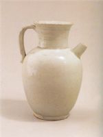 高颈,喇叭口,口沿外侈,卵形肩腹,餅装底,肩部前置管状短流,後。後置双圆條鋬手,与口沿相聯击,造型典型、简洁。器體内外满施白釉,底部露胎,釉色匀润,白中闪青,胎骨细腻坚细,为河北邢窑晚唐时期的优质产品。