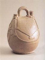 小口,半圆形提樑,鼓腹、平底、壶上饰凸起纹样,即半浮雕,仿皮囊形作工,上部有鞍形装饰,通體施白釉,微闪黄,胎白质细坚硬,中亚,西亚人经(丝绸之路)到长安,常在马或骆驼上带装水的皮囊马蹬壶,以备路远口渴饮水用,白瓷马蹬壶就是仿其澆制。