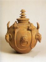 三节罐,陶质,蓋为四層圆形图。罐腹以凸稜为六个椭圆形几何纹,上飘六朵几何纹形云,椭圆形内各雕塑一个狮或羊。三个狮首相同,巨目粗眉,口含圆形环,凶猛狰狞;三个羊首圆眼长捲角,性格温顺。狮羊形态各异,凶猛与温顺相间排列。构思巧妙,精工细雕,形象生动,具有很高的艺术水平。
