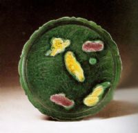 辽三彩盘、碟的装饰手法有刻、划、印三种,制作时,先在坯上作出花纹,再依据花纹的特点施三彩釉。