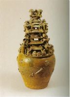 堆塑罐上,塑九层庑殿式楼台,并塑有阙、钩栏、庑廊、观楼。罐身及楼台上塑有虎、羊、辟邪、蜥蜴、犬、猴等动物,还塑有侍俑、骑辟邪人及拿大鼎、弄丸、弹琴等杂俑二十三人。此罐殿宇巍峨,蔚为壮观
