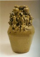 此器上部为联体五罐,即中部为整器罐口,四侧有四小罐相连,四罐下至肩腹间堆塑各式人物、鸟禽、走兽等,腹部鼓出,下部微手,整器形体稍觉颀长,装饰性较强,通体施青釉,釉层不够匀净,整体制作具有早期青瓷的粗率豪放风格。