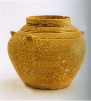 体形硕大。高领,阶梯状厚肩,圆鼓腹下收,平底。上腹部置六个半圆形系,系与肩交接处呈鸭蹼状。施青釉,釉呈黄色,有流釉现象,积釉处呈酱褐色,釉面光亮。造型凝重