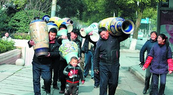 “只要你看中了,出多少钱都行。”昨日,在东风路省人民体育场前人行道上,一群景瓷商人扛着大瓷器,边走边卖。这种搞怪的方法吸引了不少路人的眼光。“销售不景气,不得已把瓷器搬上街。”其中一名商人说。