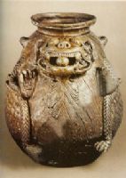 胎灰色,釉青色微泛灰。盘口短颈,斜肩圆腹,平底,状似鱼篓。肩腹之间两侧各有三横条作品字式排列,腹壁堆塑兽形,嘴含圆珠,双目突出,其两侧饰绳状物各一条,下垂近底作爪形,似两爪伏地蹲坐。