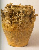 罐平底深腹,罐形口,肩部丰满,肩上有四小罐,其间堆贴四组人物群塑。