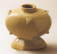 小口,直颈,扁圆腹,圈足呈扁圆状。肩与下腹装有对称的横系,用以穿绳提携。肩部和圈足环绕联珠纹和细斜方格纹。