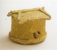 器为圆形茅舍状,屋顶塑有沟檐。正面屋门半掩着,内设粪坑、脚蹬。门旁塑一洞孔,一狗正欲钻入。施青釉,略泛青绿色。造型形象生动,民间生活气息浓郁。
