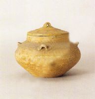 罐方唇,直领,溜肩,鼓腹下收,平底稍内凹。肩腹处有两两相对的四个横耳。带盖,器盖间有一桥形钮,钮下为一圈凹弦纹,外饰波浪纹一圈,再外饰三圈凹弦纹。