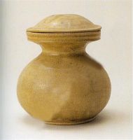 青瓷带盖唾壶,椭肩圆腹,盘口,浅圈足,口上覆一子口器盖,盖形如一倒扣的撇口折沿圜底小碟,盖沿与盘口齐平,两者相扣颇为严阖。器腹上小下大,呈圆梨形,底为浅平圈足,通体施青釉色,黄绿相间,颇显雅丽。青瓷唾壶,一般东晋以前出的多为敞口,带盖并带托的唾壶多见于南朝,而这件唾壶则出于鄂西何田埠的东晋墓中,卻有盖而无托,表现出由东晋向南朝演变发展的序列。
