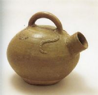 器身呈礅形,中部鼓出,底内凹,肩腹间置一略上仰的筒状口,顶部安一个弧形提梁。提梁两端内侧各贴塑一条向两边弯曲伸展的带状纹,提梁后端外侧饰一较短的带状纹,以象征虎的四足和尾。顶至腹上部尚划有五道弦纹。施青釉,不及底,釉层均匀,光泽柔和。