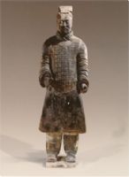 头戴长冠,两端有带,结于颏下,项系曲领,身穿短裾,外套背带式鎧甲,谨着前胸,下有战袍,腰束革带,足蹬钩履,站立于长方形方板上。整个装束灵活、轻便、威武,没有臃肿之态。
