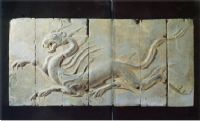 这是一组拼砌画像砖,在七块并列的长方体砖的侧面分短模印组合成一虎纹,虎大张口,细长颈,身体弯曲,尾端上扬,身躯四肢雄健有力,既具有浓厚的装饰意味,又透出山林兽王的雄威和祥瑞气氛。