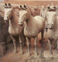兵马俑一号坑车马与御手俑,属军阵前锋,两翼与后卫守护的中部、主体部位按一定规则分佈,其为驷马战车。在军阵里驷马挽战车,非常注目,齐头并立,排列整齐。后有御手与车士,具体称之车兵,其配套设施是一具单辕的驷马战车,乘员是戴长冠、着铠甲的御手和两名着甲的车士.