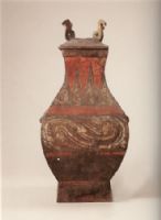 钫为敞口鼓腹,方形圈足,有盖,盖顶四角饰。通体以红、白色彩绘出锯齿纹、云气纹。钫即方形壶,用以盛装酒浆或糧食,盛行於战国末西汉初。陶钫是仿铜礼器,西汉时期的墓葬中,多和陶鼎,陶敦等器成组出现。