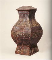 钫,泥质灰陶,模制。平唇,口微外侈,鼓腹,高圈足,肩有铺首,盖作盝顶形,盖与身子母口相合。